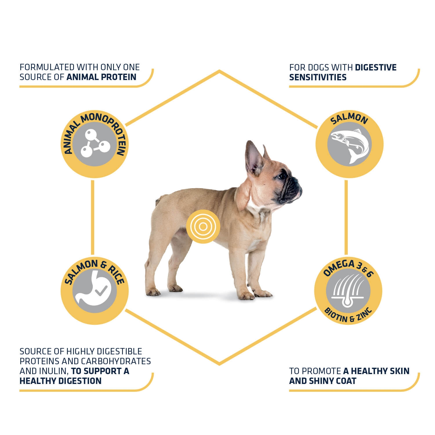 Advance Mini Sensitive med lax hundfoder är ett helfoder för små vuxna hundar under 10 kg som har problem med matsmältningen.
