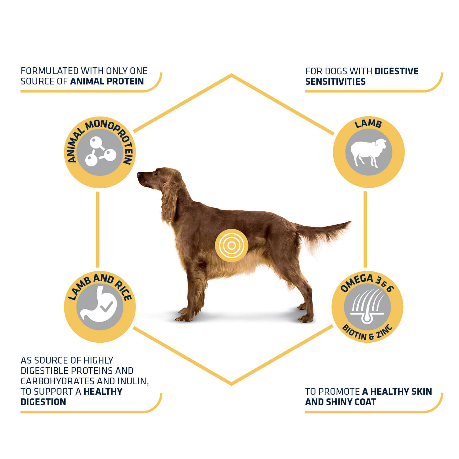 Sammansättning: Lamm (17%), majs, majsprotein, ris (14%), animaliskt fett stabiliserat med blandade tokoferoler av naturligt ursprung, torkat lammprotein, majsmjöl, betmassa, hypoallergen arom, fiskolja, kaliumklorid, frukto-ligosackarider, salt, naturliga polyfenoler (0,01%).