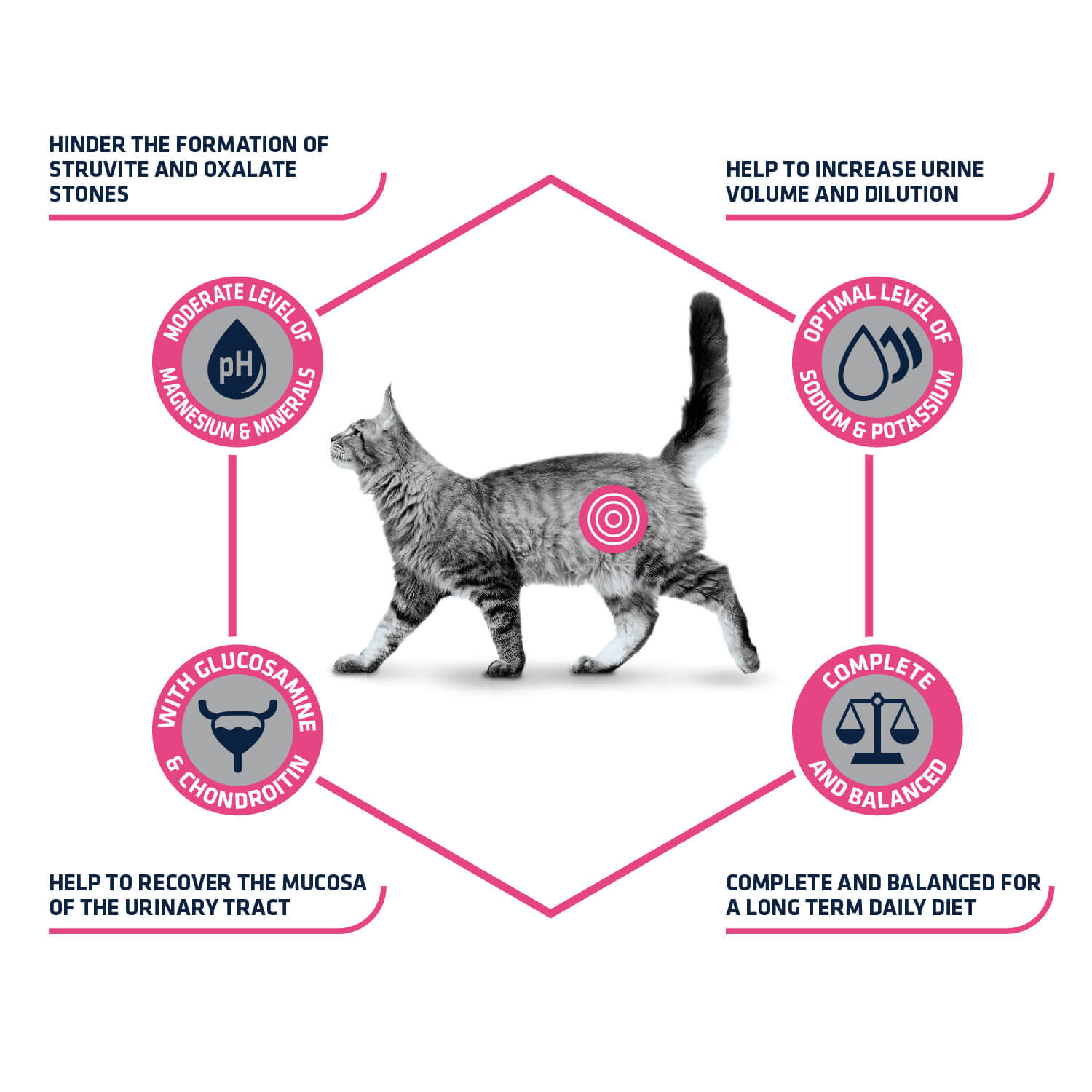 Sammansättning: Kyckling, majsprotein, vete, torkade fläskproteiner, ris, torkade fågelproteiner, majsmjöl, majs, animaliskt fett stabiliserat med en blandning av tokoferoler av naturligt ursprung, hydrolyserade animaliska proteiner, salt, kaliumklorid, fiskolja, kaliumcitrat, glukosamin (400 mg/kg), kondroitinsulfat (100 mg/kg), Urinförsurande ämnen: majsprotein, fosforsyra, metionin.