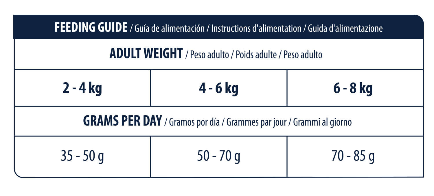 Utfodringsråden finns på förpackningen och i näringstabellen som finns bland bilderna på denna sida. Det rekommenderas att du delar upp den dagliga mängden foder på minst två måltider. Förvara fodret på en sval och torr plats och se till att det alltid finns gott om dricksvatten tillgängligt. Hållbarhetstiden anges på förpackningen och är vanligtvis tillräcklig om du håller dig till den rekommenderade användningen. Råden i näringstabellen är endast riktlinjer; andra faktorer som ras, kön, aktivitetsnivå m.m. spelar också en roll för ditt husdjurs dagliga näringsbehov.