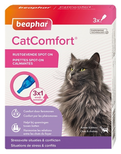 Beaphar CatComfort No Stress spot-on för katt hjälper din katt att känna sig mer trygg, oavsett var den befinner sig. Detta sker tack vare feromoner som känns igen av katten. Produkten är särskilt lämplig att använda i nya situationer för katten, såsom sociala interaktioner, nya familjemedlemmar i hemmet, under träning eller när flera katter lever tillsammans. Dessutom hjälper den till att minska beteendeproblem som aggressivitet, konflikter, överdrivet jamande, slagsmål, undvikandebeteende, rädsla och att katten gömmer sig.