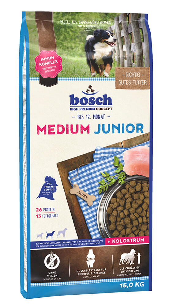 Bosch Medium Junior hundfoder är ett helfoder och har utvecklats speciellt för valpar med en vuxenvikt på mellan 15 och 25 kg. Fodret är rikt på färskt fågelkött och har därför en utmärkt smak. Bosch Medium Junior hundfoder är vetefritt och därför också extra lättsmält.