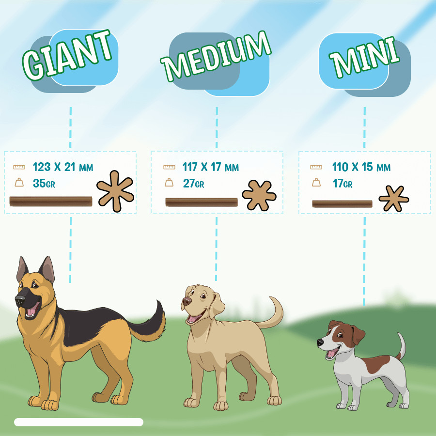 Ge helst 1 pinne per dag och se till att din hund alltid har tillgång till färskt och rent dricksvatten. Dessa pinnar är inte lämpliga för valpar under fyra månader. När du ger din hund tuggprodukter rekommenderar vi att du alltid övervakar din hund medan den tuggar. Vi tar inte ansvar för eventuella skador som din hund kan drabbas av till följd av att den tuggar på tuggben eller andra tuggprodukter.