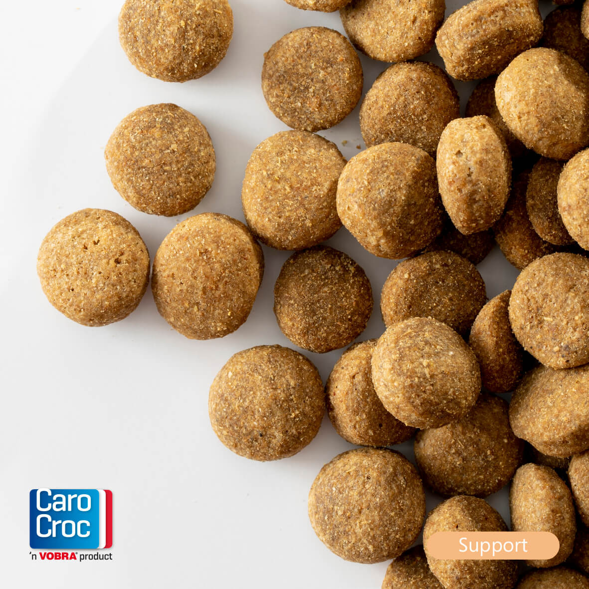 Carocroc 23/11 Support hundfoder är ett helfoder som passar vuxna hundar av alla raser. Fodret är speciellt utvecklat för att hjälpa till att förebygga allergiska reaktioner på grund av födoämnesallergi eller intolerans. Fodret innehåller t.ex. lamm (9%), en högkvalitativ råvara som är allergivänlig. Dessutom innehåller Carocroc 23/11 Support hundfoder alla nödvändiga byggstenar som din hund behöver för att upprätthålla starka muskler, starka ben, friska tänder, väl fungerande organ och en vackert glänsande päls. Ett perfekt stöd för din hund, som du kommer att se återspeglas i din hunds vitalitet och glada utseende!