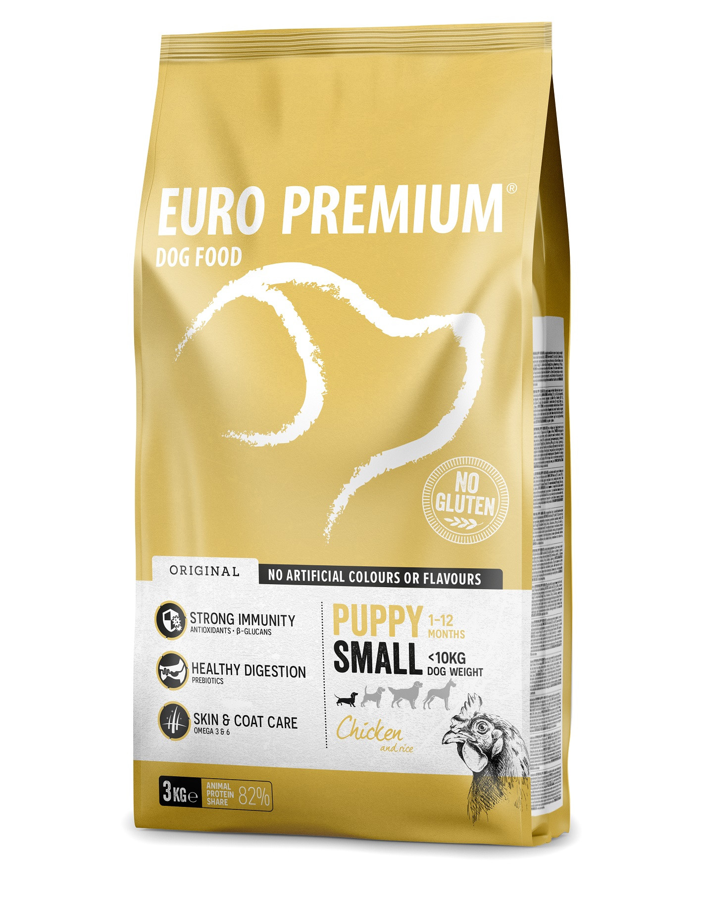 Euro Premium Puppy Small Chicken & Rice hundfoder är ett komplett, energirikt foder för valpar (1–12 månader gamla) av små raser (<10 kg vuxenvikt). Valpar har speciella näringsbehov eftersom de är i full utveckling och små valpar har en snabbare ämnesomsättning. Animaliska proteiner från kyckling tillsammans med mineraler bidrar till utveckling av starka tänder, ben och muskler. Detta foder ger din valp tillräckligt med energi för att kunna leka och växa. Tack vare det höga energiinnehållet i fodret är det också lämpligt för dräktiga och digivande tikar. Eftersom dessa torrfoderbitar är tillverkade med ris istället för glutenhaltiga spannmål, passar fodret till hundar med glutenintolerans.