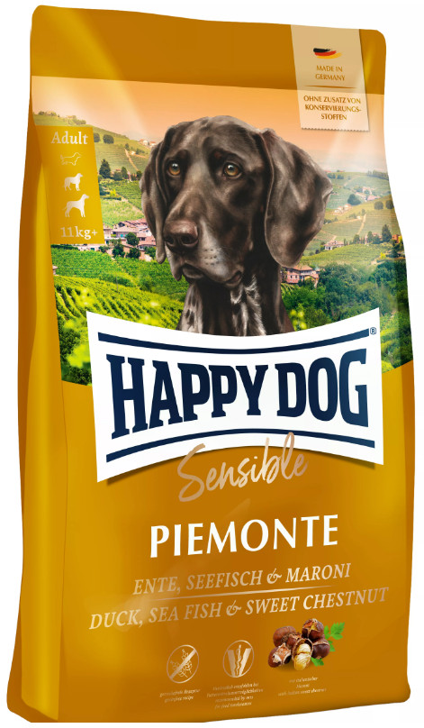 Happy Dog Supreme Sensible Piemonte hundfoder är anpassat för känsliga vuxna hundar med foderintolerans eller allergi. Fodret är fritt från gluten, spannmål och potatis. Innehåller lättsmält anka, delikata havsfiskar och italienska kastanjer.