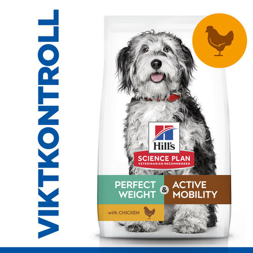 Hill's Adult Medium Perfect Weight & Active Mobility hundfoder med kyckling är ett komplett torrfoder som hjälper din medelstora vuxna hund att uppnå och bibehålla en hälsosam vikt.