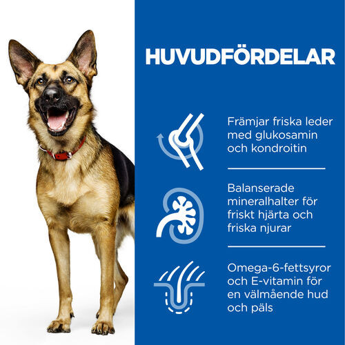 Äldre hundar har andra behov än unga valpar. Därför har Hill's utvecklat varianten Hill's Science Plan Mature Adult Large Breed hundfoder med kyckling speciellt för åldrande hundar. Detta torrfoder tillgodoser näringsbehoven hos åldrande stora hundar som är 6 år eller äldre. Fodret är berikat med glukosamin och kondroitin för att främja ledhälsan. Fodret är lättsmält, vilket bidrar till att stödja energi- och aktivitetsnivåerna. Balanserade mineraler stödjer även hjärta och njurar. Vårdande omega 6-fettsyror och vitamin E hjälper till att hålla huden och pälsen i gott skick. ActivBiome+ Multi-Benefit Teknologi främjar en god grund för livslång hälsa genom att stödja matsmältning, immunförsvar och organhälsa med en specialblandning av prebiotiska fibrer och antioxidanter.
