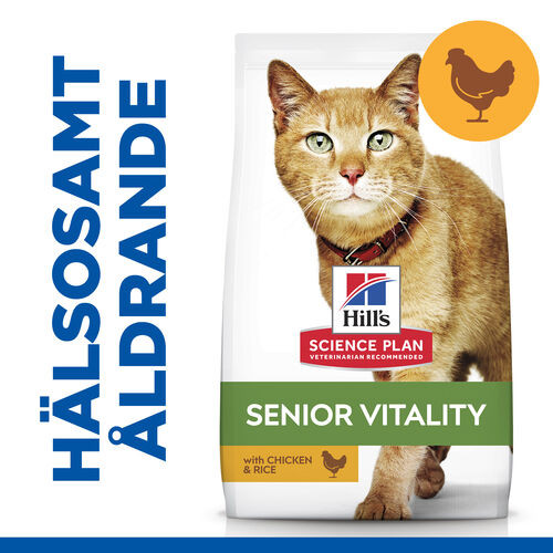 Hill's Science Plan Mature Adult Senior Vitality kattfoder med kyckling & ris är ett torrfoder för äldre katter som bland annat ger bättre kondition och hjärnfunktion.