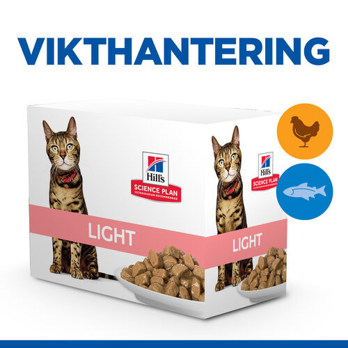 Blötmaten är lättsmält och förpackad i måltidspåsar på 85 gram, vilket gör maten lätt att servera. Tillsatsen av omega 6-fettsyror och E-vitamin bidrar till en frisk hud och en glänsande päls. Hill's Adult Light kombipack kyckling & havsfisk blötmat är tillverkat av ingredienser av hög kvalitet och rekommenderas ofta av veterinärer.