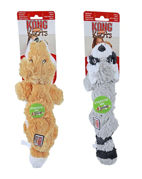 KONG Scrunchknots hundleksak är en rolig leksak som din hund garanterat kommer att intressera sig för länge. Leksaken har mjuk päls på utsidan och robust knutet rep på insidan. Kong ger ifrån sig ett roligt gnisslande ljud som fångar din hunds uppmärksamhet. Denna Scrunchknots finns i 2 olika storlekar. Du kan t.ex. välja mellan en Medium/Large räv och en Small/Medium tvättbjörn. Leksakerna är inte avsedda för långa och omfattande tuggsessioner. Leksakerna innehåller ingen fyllning, så det blir mindre kladd efteråt.