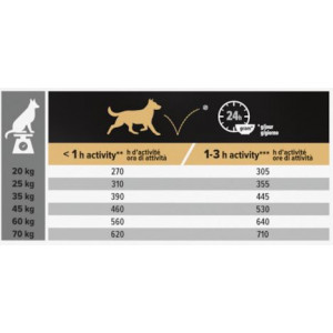 Tabellen med foderrekommendationer hittar du på förpackningen samt i bildspelet högst upp på denna sidan. Mängden foder i tabellen är endast riktlinjer och du bör justera fodermängden beroende på din hunds fysik, aktivitet och andra individuella behov. Det rekommenderas att dela upp den dagliga mängden foder på minst två måltider. Du bör regelbundet låta din veterinär kontrollera din hunds hälsa.