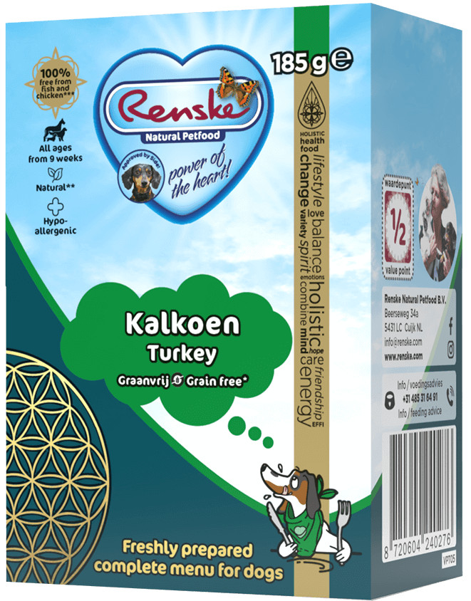 Renske Grain Free freshly prepared kalkon våtfoder hund (tetra) är en komplett, spannmåls- och glutenfri köttfoder för alla hundar från 9 veckor gammal.