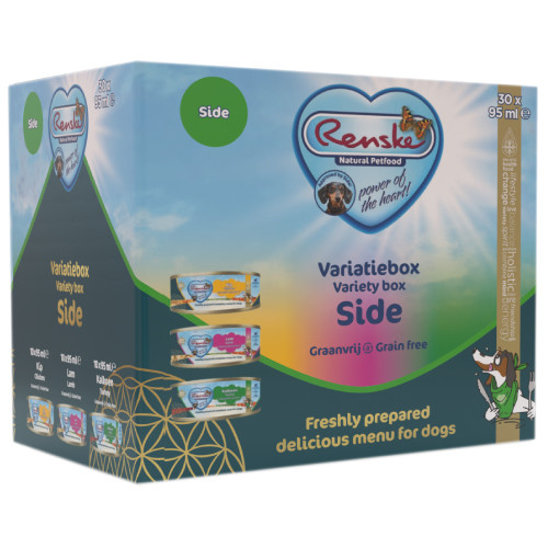 Renske Variety box Side Grain Free freshly prepared våtfoder hund (burk) är idealiskt våtfoder att kombinera eller variera, även med torrfoder. Boxen innehåller 30 måltidsburkar i tre läckra varianter: kyckling, lamm och kalkon.