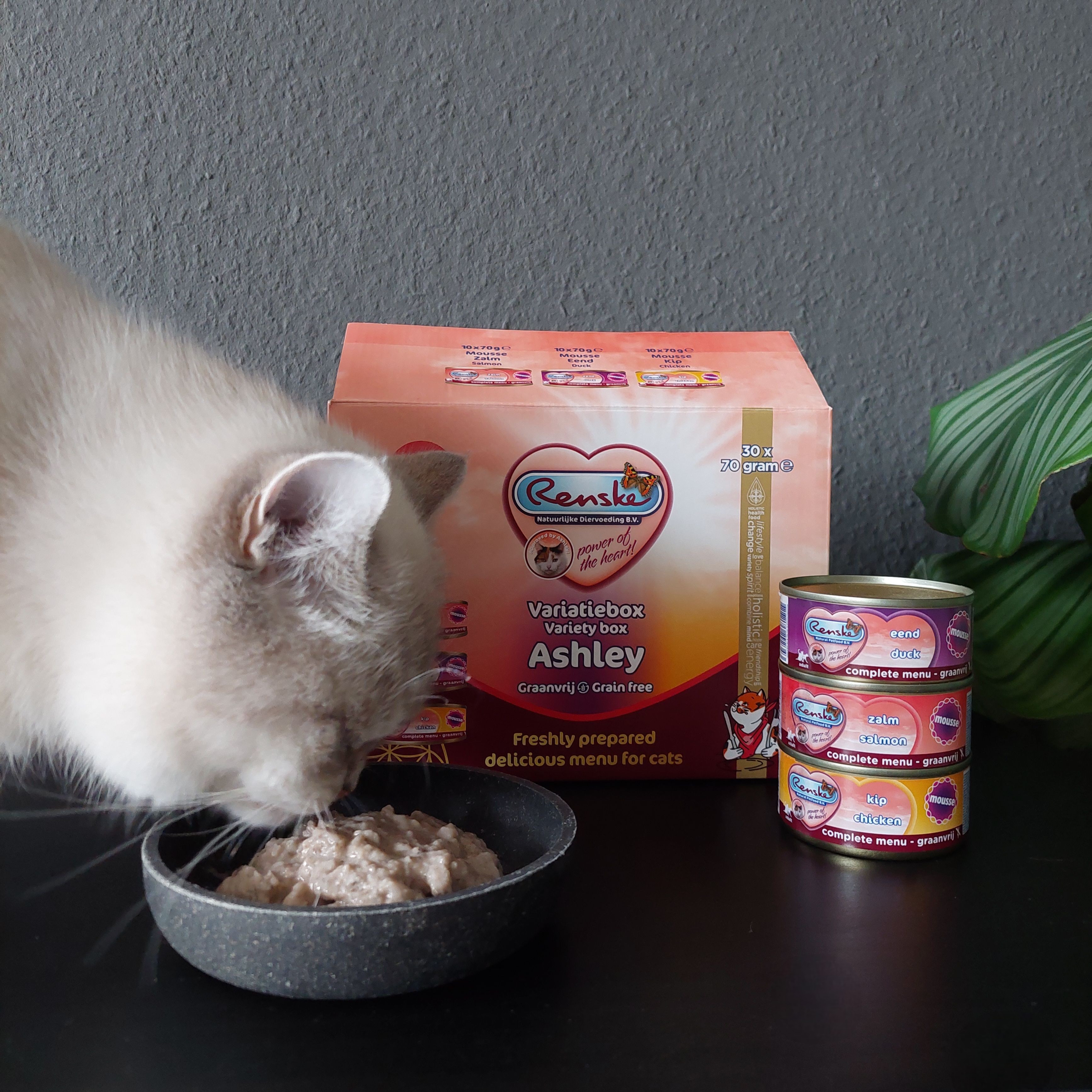 Renske Variety box Ashley Grain Free freshly prepared mousse våtfoder katt (burk) är en praktisk variationförpackning med tre läckra smaker av Renske våtfoder mousse för katter. Boxen innehåller 10 burkar mousse med lax, 10 burkar mousse med anka och 10 burkar mousse med kyckling. Måltiderna har kött eller fisk som huvudingrediens och är lätt ångkokta, vilket gör att näringsämnena bevaras optimalt, men maten är inte längre rå.
