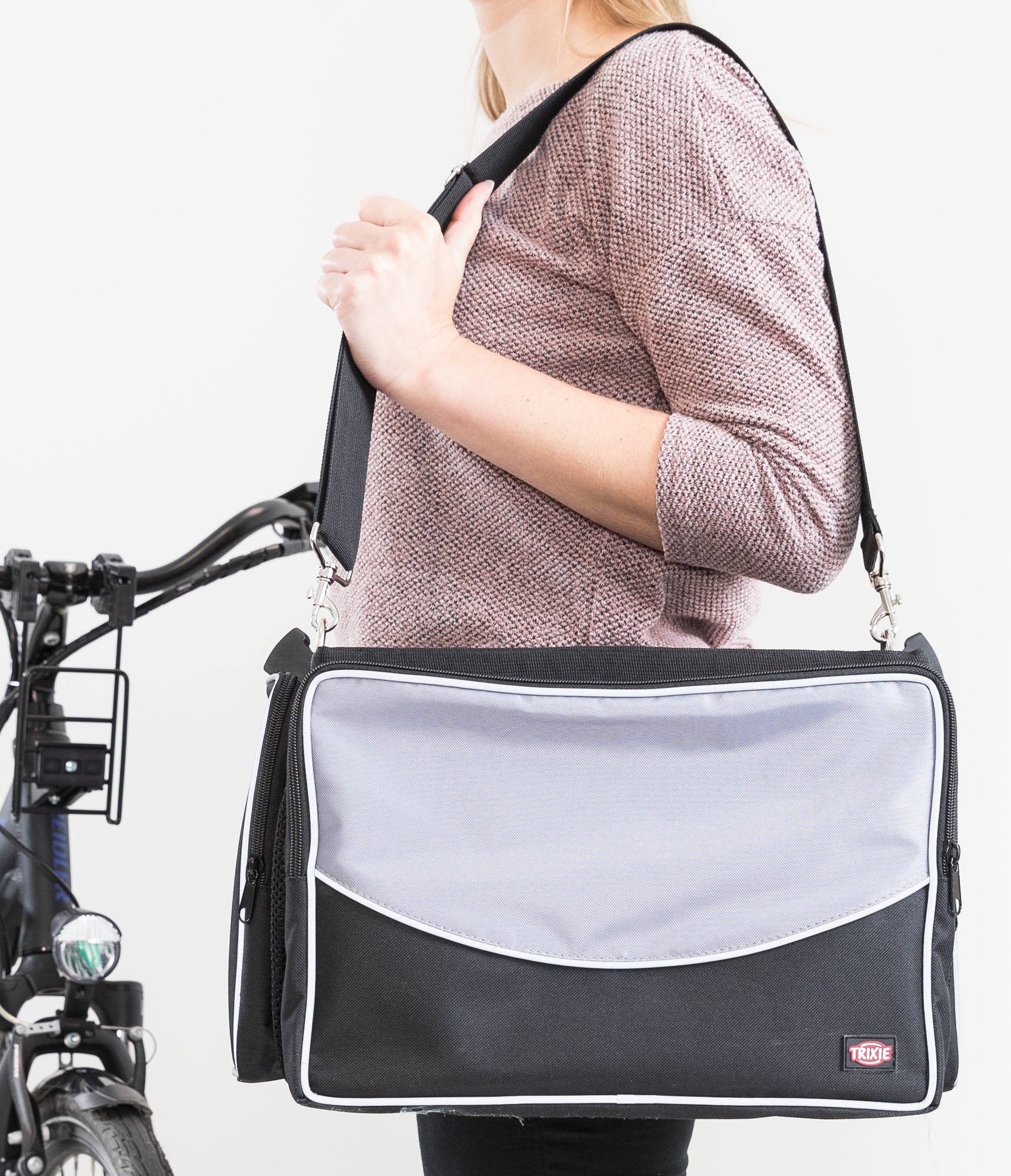 Cykelväska för hund och katt för styret är en praktisk väska för transport av husdjur upp till 6 kg. Den är tillverkad av slitstark polyester och har två sidoytor med dragkedja och en frontyta med kardborreband. Stabila fästen gör det enkelt att fästa väskan på styret. Väskan har reflekterande kanter som gör att den syns bra även i mörker. Bottenplattan är löstagbar och väskan är lätt att vika ihop till ett litet paket. Du kan också använda väskan som axelremsväska. Dessutom är väskan säker, eftersom det finns ett integrerat fäste som hindrar ditt husdjur från att hoppa ut. Måtten på väskan är de totala yttermåtten. Det betyder att den mäts från de bredaste punkterna. Detta inkluderar sidofickorna.