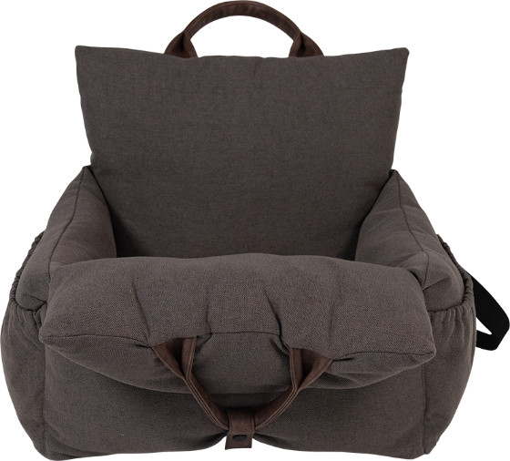 Med handtag upptill är bilstolen lätt att bära och placera var du vill. Måtten 50x42x42 cm gör bilstolen lämplig för mindre hundraser och passar i alla baksäten.