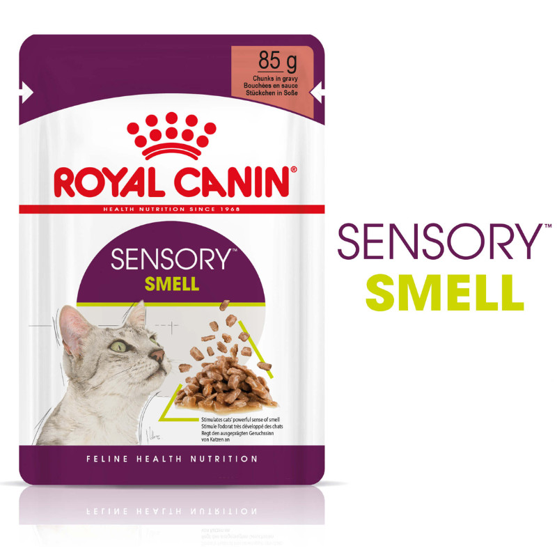 Royal Canin Sensory Smell våtfoder är ett utsökt våtfoder för vuxna katter. Produktserien Sensory är utformad för att stimulera din katts sinnen. Våtfodret är förpackat i måltidspåsar om 85 g.