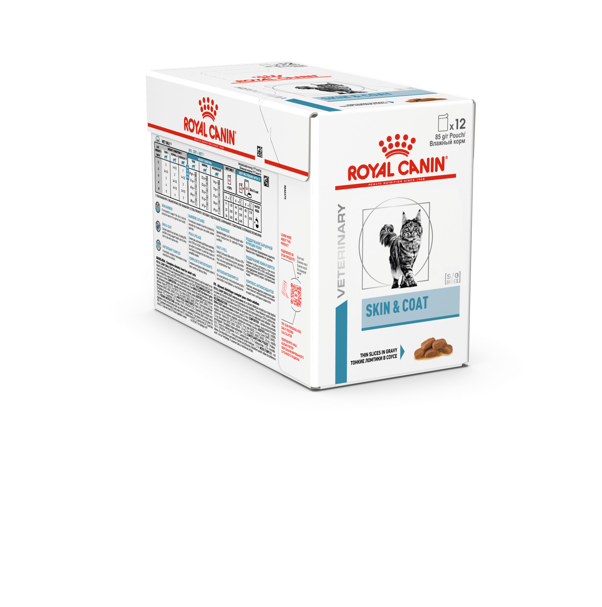 Royal Canin Veterinary Skin & Coat våtfoder katt (12 x 85 g påsar) är ett speciellt sammansatt veterinärfoder för vuxna katter som hjälper till att stödja hudens funktion vid hudåkommor och kraftigt håravfall. Detta kompletta dietfoder är lämpligt för vuxna katter.
