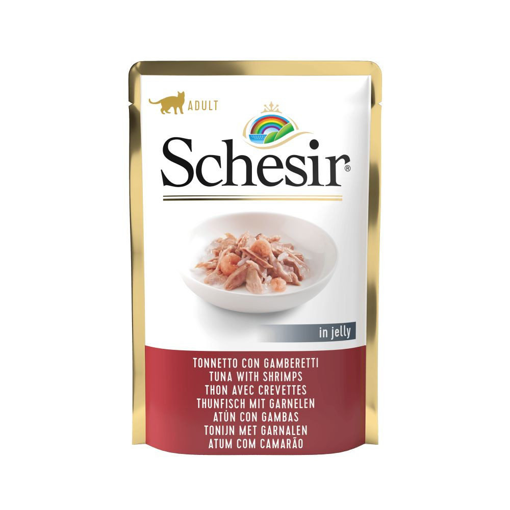 Schesir tonfisk med räkor (i gelé) våtfoder katt (påsar) är ett komplett våtfoder som passar alla vuxna katter. Det höga innehållet av tonfisk och de smakrika räkorna gör fodret extra gott, så även de mest kräsna katterna brukar inte kunna motstå det.