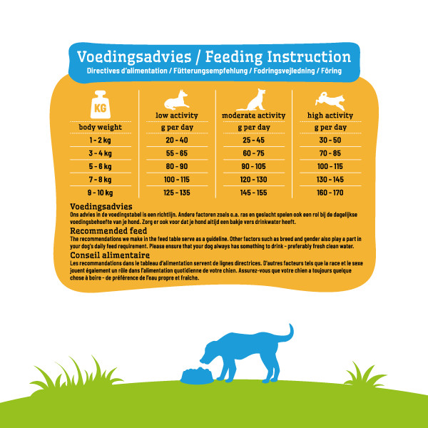 Det rekommenderas att dela upp den rekommenderade dagliga mängden i minst två måltider. Förvara fodret på en sval och torr plats och se till att det alltid finns tillräckligt med färskt dricksvatten tillgängligt. Hållbarheten står på förpackningen och är oftast tillräcklig när du följer de rekommenderade användningsanvisningarna. Råden i näringstabellen är vägledande; andra faktorer som t.ex. ras, kön och aktivitetsnivå spelar också en roll i ditt husdjurs dagliga näringsbehov.