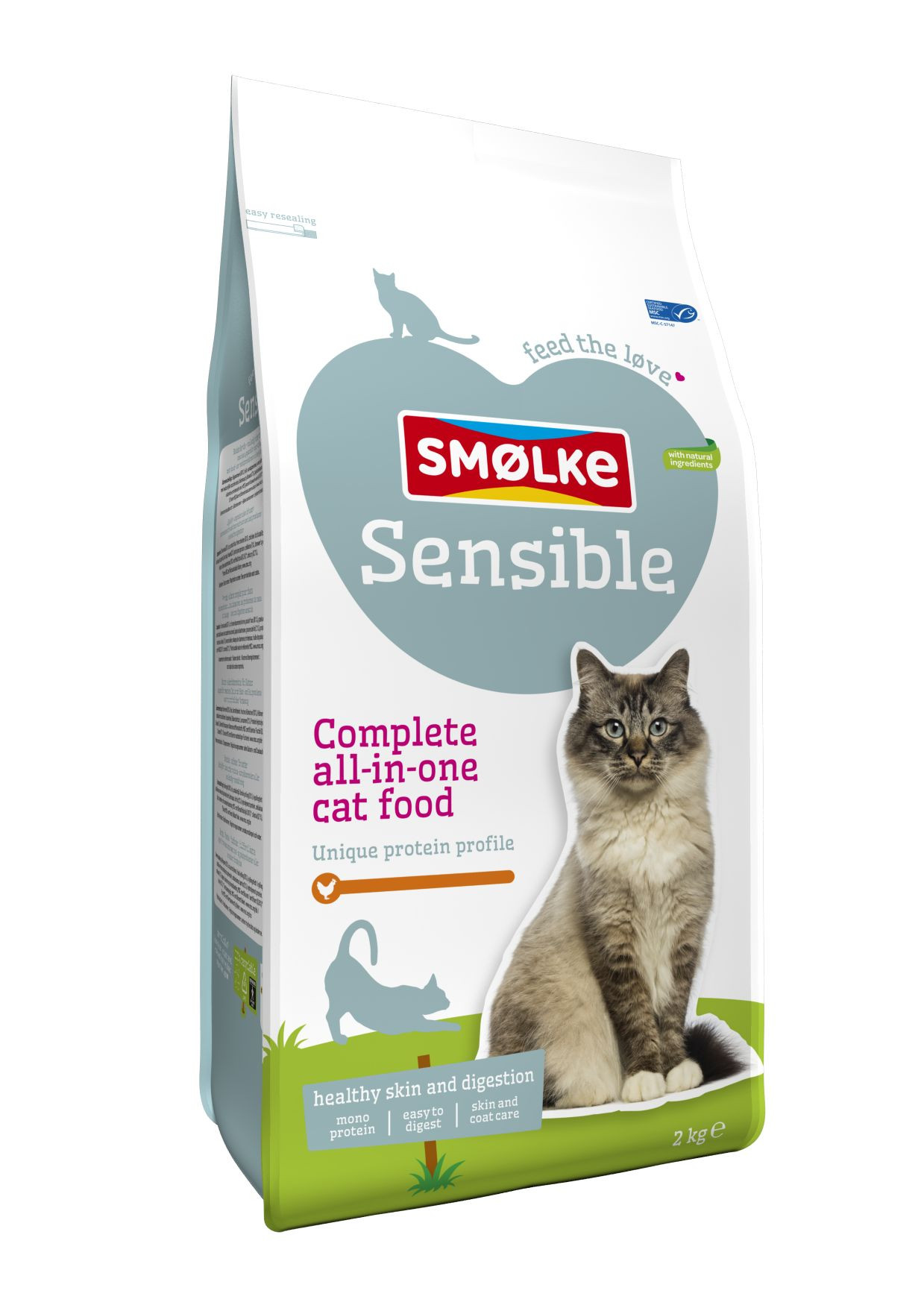 Smølke Sensible kattfoder är ett balanserat allt-i-ett helfoder med naturliga ingredienser för katter med känslig hud och päls eller känslig matsmältning.
