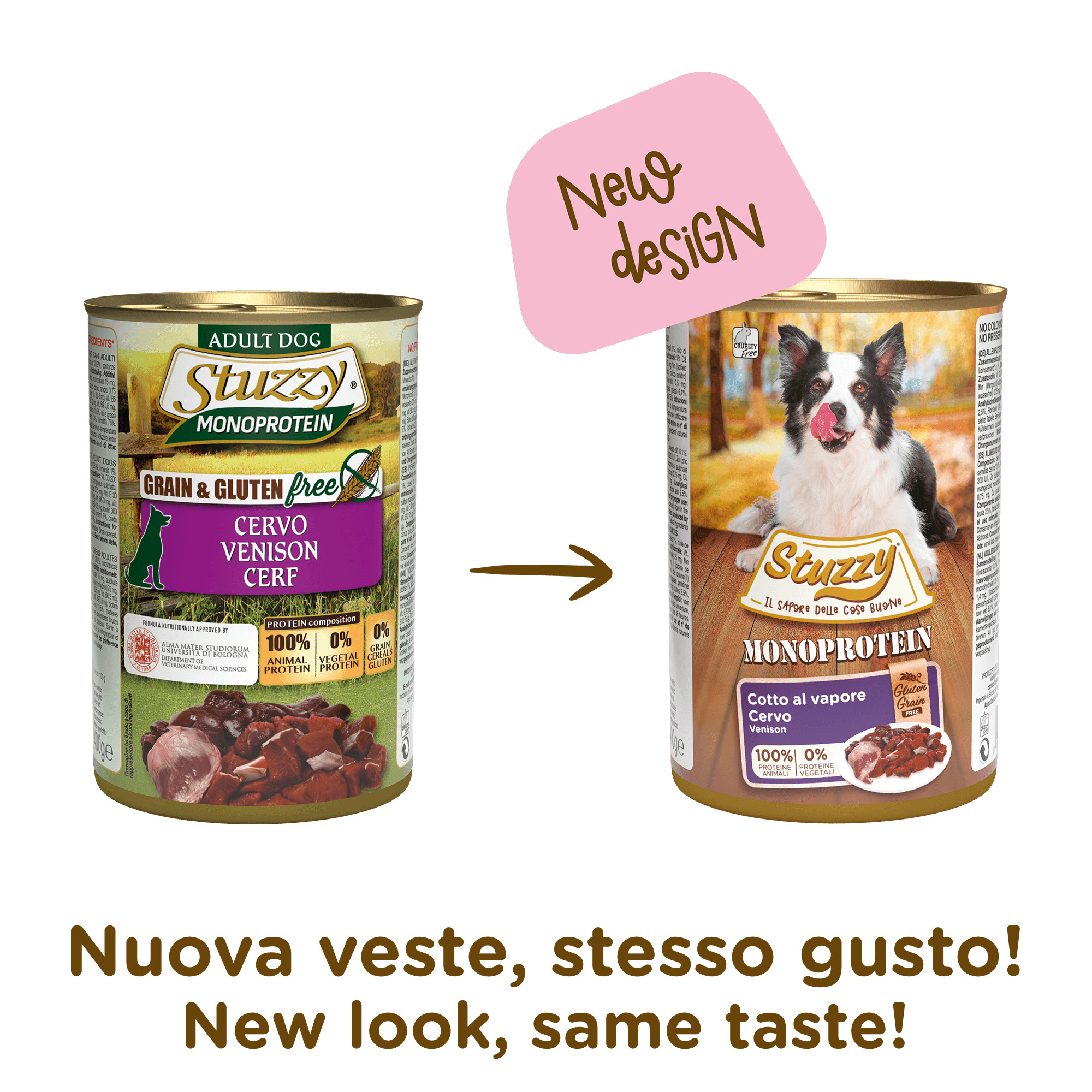 Stuzzy Monoprotein hjortkött våtfoder hund (400 g) är ett spannmåls- och glutenfritt våtfoder för vuxna hundar från 1 år och uppåt. Fodret innehåller hjortkött som enda animaliska proteinkälla och är fritt från färgämnen och konserveringsmedel. Våtfodret har en hög kötthalt på minst 70% och innehåller lättsmälta ingredienser. Stuzzy's läckra måltider finns i olika smaker, så att du kan överraska och skämma bort din hund med en ny smak varje dag.