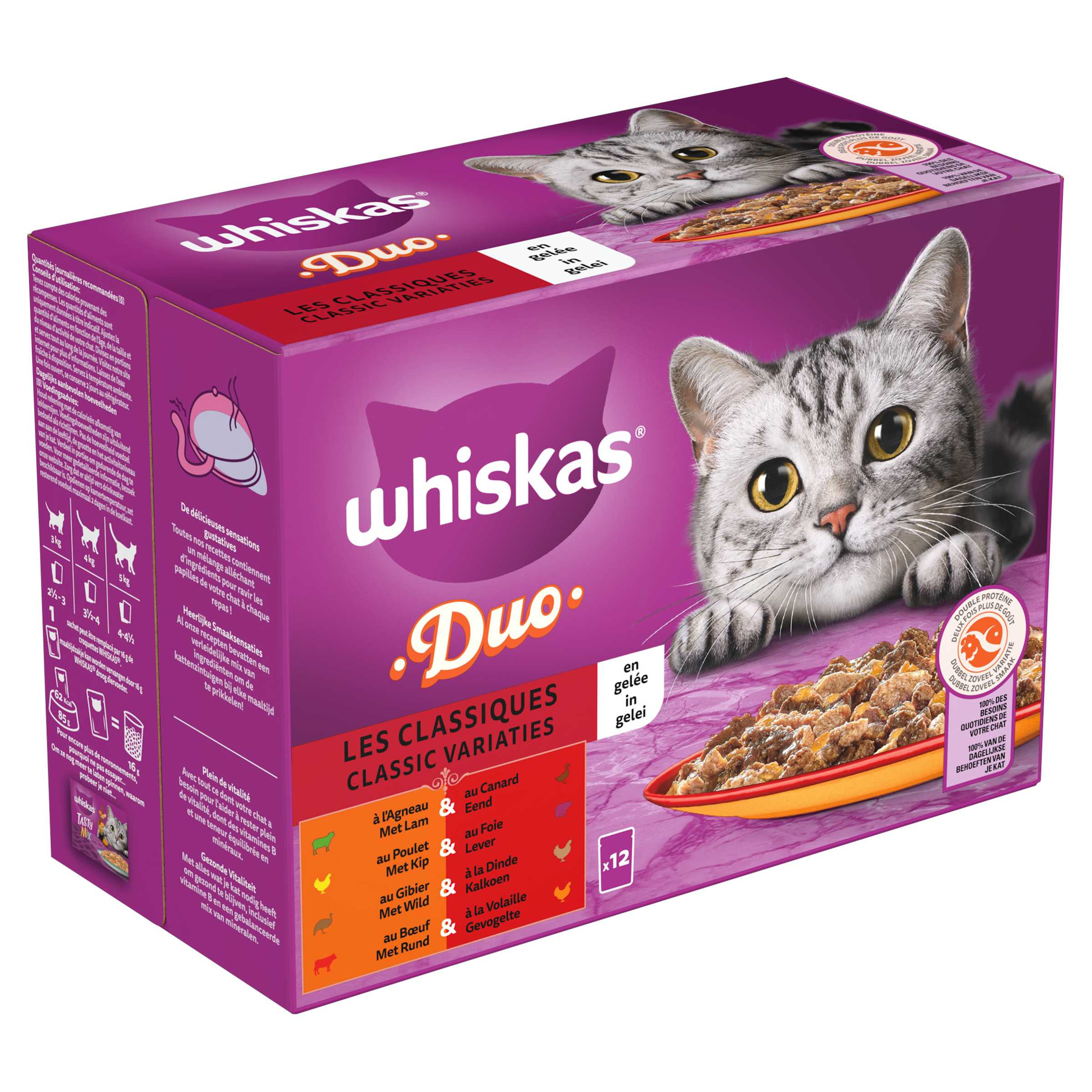 Whiskas 1+ Duo Classic Variations i gelé våtfoder katt multipack (85 g) innehåller 12 läckra, kompletta måltider för din vuxna katt. Förpackningen består av 3 x 4 olika recept som din katt kommer att älska.